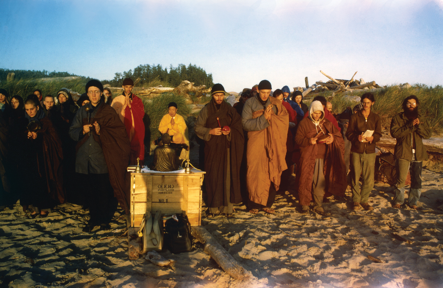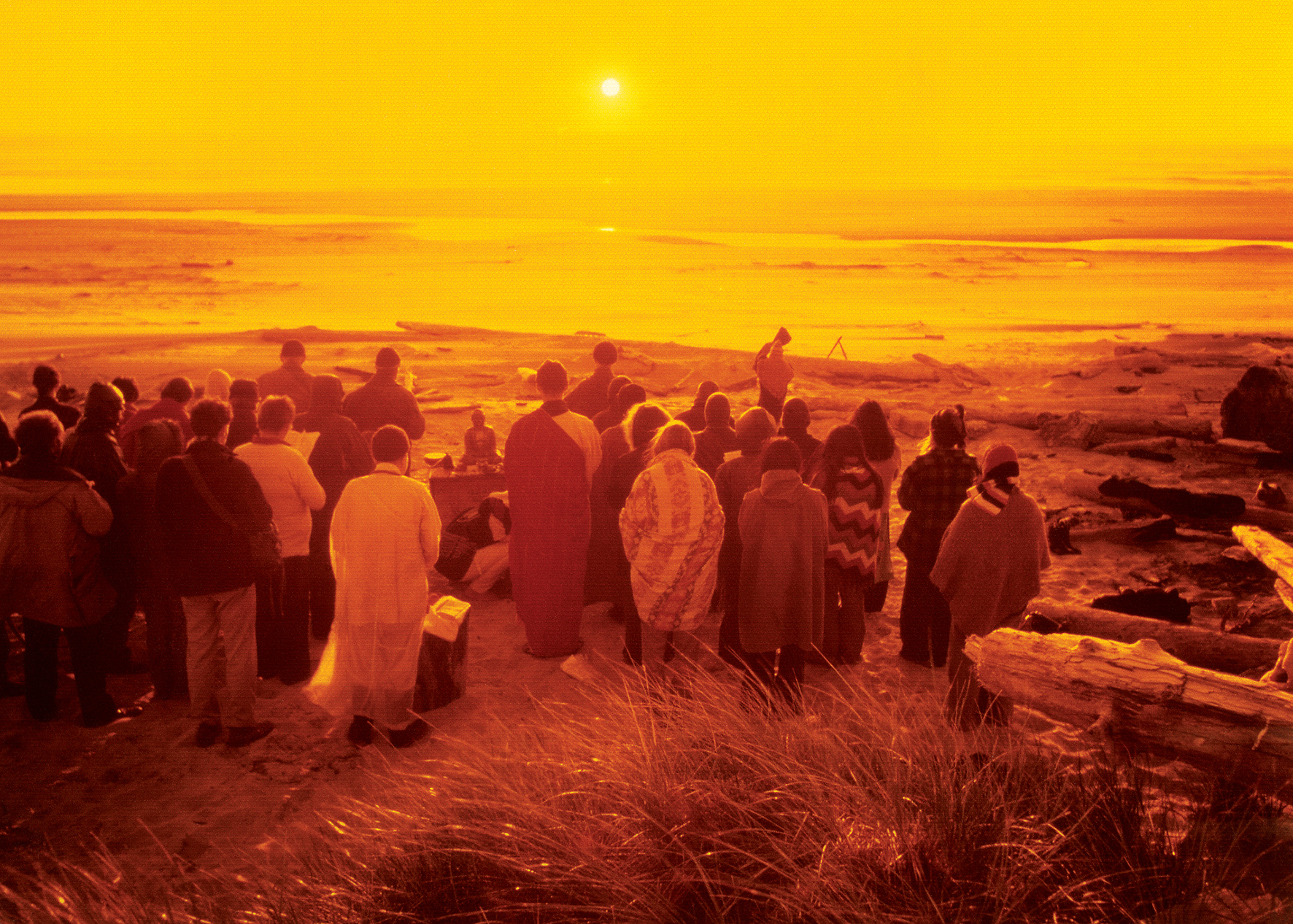 大众驱车至海边,于日落中作大迴向功德,默念《十六观经》中之初观──落日观:观想落日,状如悬鼓。