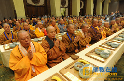 十一點在五觀堂舉行「千僧齋」,讓與會者體驗漢傳佛教傳統的過堂儀式,午齋只有一飯、一菜、一湯,但卻是美味無比,令人生起感恩惜福之心。齋後千餘名會議代表,齊聚戶外舉行大合照,讀者可自行想像此壯觀之場面!