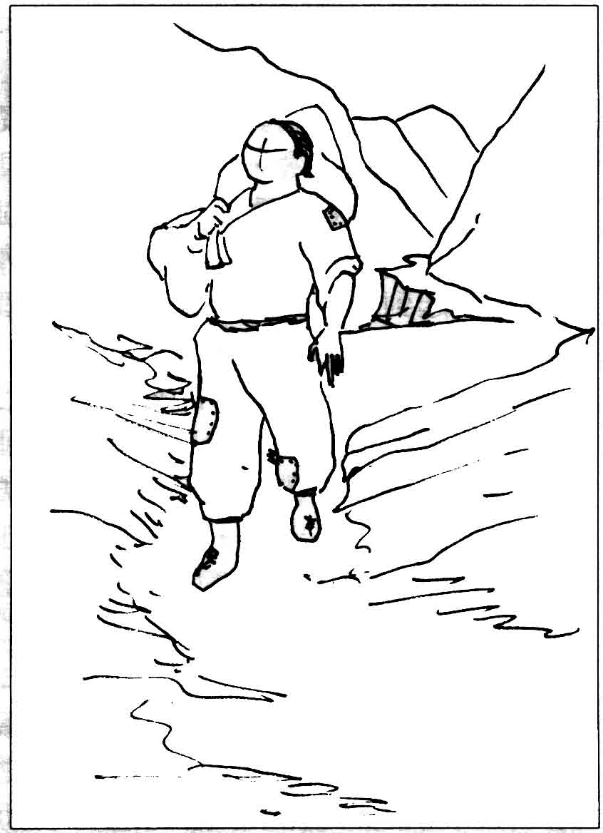 At the time, he thought: "Oh! This treasure must be worth a great deal of money, but if we have to divide it between the two of us, the money will be less; if one person takes the whole thing, the money it brings in will never run out." Therefore he schemed to murder his sworn brother. How did he do it? Very simple. The mountain paths were rugged and overgrown with bushes and trees as sharp as swords. They were really difficult to travel. Seeing the crooked paths, as well as the overhanging precipices and steep cliffs, he thought, "Ha! Okay, sworn brother, I'll let you walk in front of me, and when we reach a dangerous place, I'll just give you a push, and then you will fall to your death--all the bones in your body will be smashed! Then the treasure will be all mine!" Thinking in this way, he pushed his sworn brother into a mountain torrent.