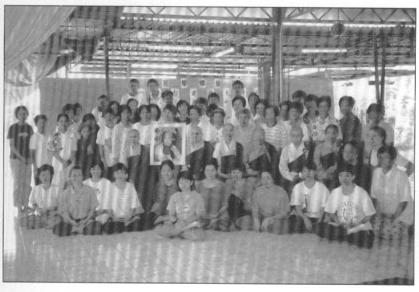 The whole ceremony was conducted without difficulty and the great assembly was blessed with fine weather and occasional rain throughout the seven days of bowing. In fact, for the first three days there was a tremendous downpour at the time of the transference of merit and virtue. The Dharma Master explained that the gods and the dragons of the eight divisions were extremely delighted with the ceremony and the dragons sprinkled jewels, which we received as rainwater. The great assembly so rejoiced in this repentance that they sang their hearts out during the concluding verse at the end of each roll. Dharma Master Liang commented that everybody chanted with such vigor that the whole assembly seemed to be flying away just as "the withered blossoms (offenses) were being blown away," as described in the repentance text.