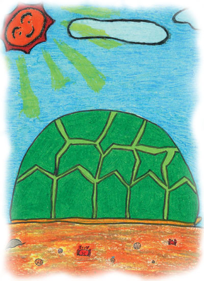 One day, he crawled onto the sandy beach to take a nap. Because he was so large, as large as a continent, he napped for a very long time, for thousands of years.