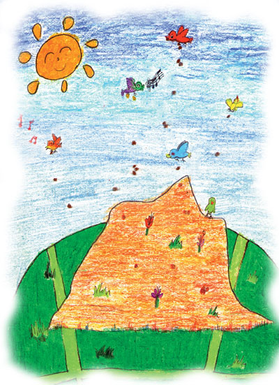 In the afternoons, the birds flew over, dropping tiny seeds onto the turtle's back. Pi-link! Pi-link!