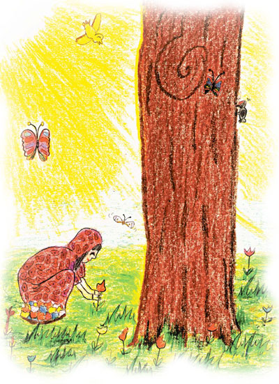 One day, not knowing the difference between the earth and the giant turtle's back, a child drifted among the mountains and valleys to pick some wild flowers.