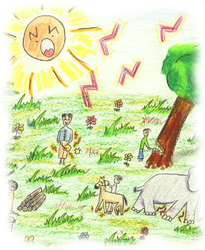 人們在馬路上開車騎馬,車轍深深地切進了龜殼內;他們的城市重重地壓在牠的背上;人們的嘈雜聲,如捶鼓似地傳入了牠的耳朵;他們所燃的火,更是燒透了牠的殼!