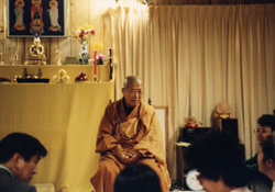 在舊金山十五街的金山寺,地上是水泥地;不論有多少供養,上人也從未花過一分錢去買地氈來鋪。齋堂是兩用的,下午又變成我們聽法上課的地方。請法完後,上人坐的是唯一的一張沙發,而且破舊不堪。有了譯經院之後,有天我看到一張中間凹下去很深的沙發;心中想:誰會供養這麼舊的東西來?!後來才慢慢想起來,那張就是 上人在十五街坐了十幾年的破沙發。心中很感慨!
